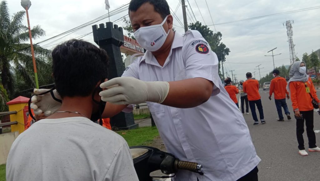 Ketua Bawaslu Kota Binjai Arie Nurwanto memasangkan masker kepada masyarakat dalam kegiatan Pembagian Masker kepada Masyarakat di depan Kantor Brimob Detasemen A Jl. Soekarno Hatta Kec. Binjai Timur Kota Binjai, Selasa (22/09/2020)