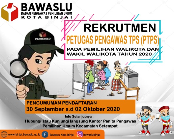 Ayo warga Kota BINJAI daftarkan diri kalian menjadi Pengawas Tempat Pemungutan Suara(PTPS) dalam rangka Pemilihan Walikota dan Wakil Walikota BINJAI Tahun 2020.