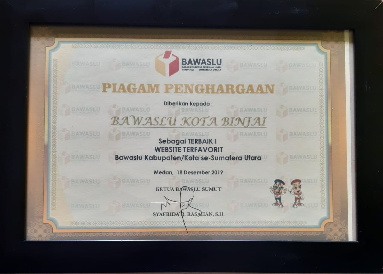 Bawaslu Kota Binjai medapatkan Penghargaan dalam kategori Website terbaik untuk Kabupaten/kota se Sumatera Utara, dan penghargaan tersebut diberikan langsung oleh Bapak Fritz Edward Siregar Anggota Bawaslu Republik Indonesia.