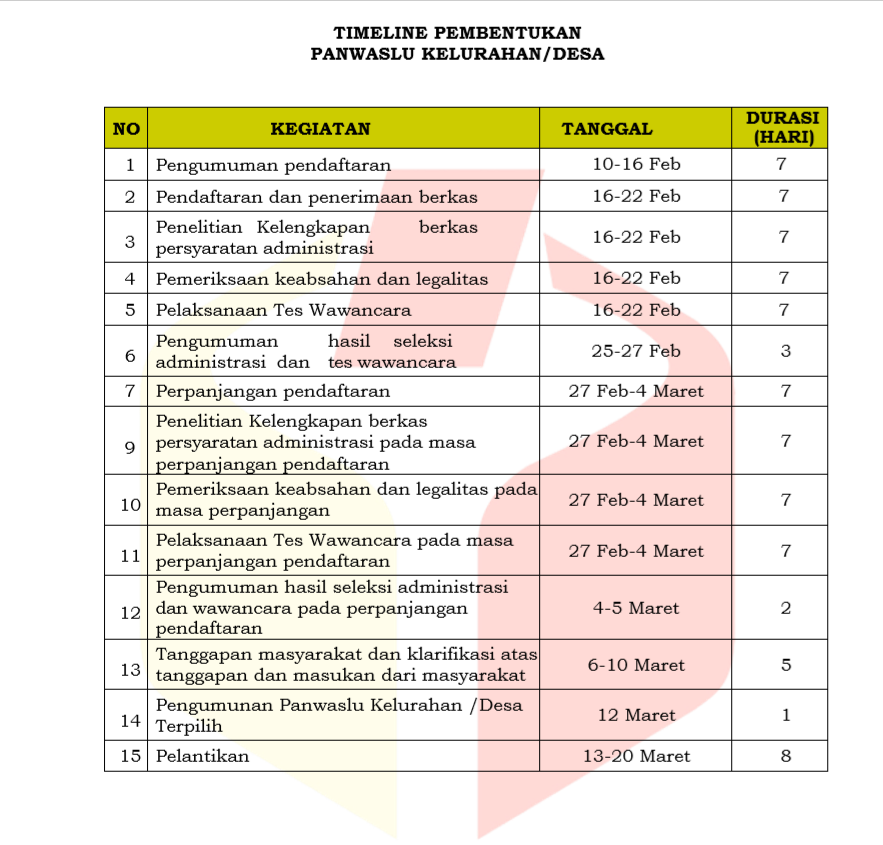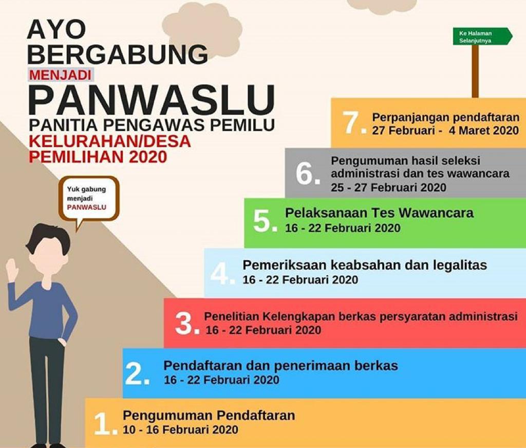 Berdasarkan Peraturan Badan Pengawas Pemilihan Republik Indonesia Nomor 19 Tahun 2017 Sebagaimana diubah terakhir dengan Peraturan Badan Pengawas Pemilihan Umum Republik Indonesia Nomor 8 Tahun 2019, bahwa Bawaslu membuka kesempatan bagi Warga Negara Indonesia yang memenuhi persyaratan untuk mendaftarkan diri sebagai calon anggota Panwaslu Kelurahan /Desa.