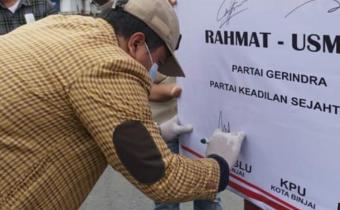 BINJAI BAWASLU - Badan Pengawas Pemilu (Bawaslu) kota Binjai menggelar deklarasi penandatanganan pencegahan, pengawasan dan penindakan pelanggaran protokol kesehatan dalam pemilu Wlikota dan Wakil Walikota tahun 2020 di Pos Lantas Tugu kelurahan Pahlawan kecamatan Binjai Utara, Sabtu (26/9/2020).