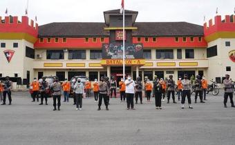 BINJAI BAWASLU - Bawaslu Kota Binjai dan Sat Brimob Poldasu Batlyon-A Pelopor Binjai bagikan ribuan masker dan semprotkan cairan Desinfektan di sejumlah titik, Selasa (22/09/2020).
